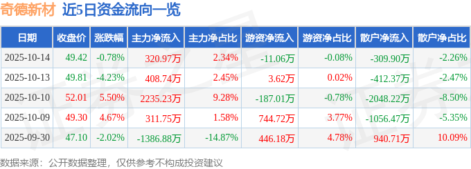 证券之星消息,截至2025年10月14日收盘,奇德新材(300995)报收于49.42元,下跌0.78%,换手率4.58%,成交量2.75万手,成交额1.37亿元。