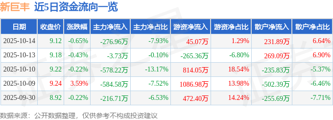 证券之星消息,截至2025年10月14日收盘,新巨丰(301296)报收于9.12元,下跌0.65%,换手率1.32%,成交量3.8万手,成交额3491.32万元。