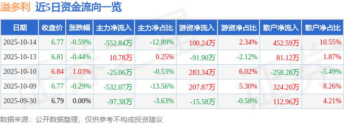 证券之星消息,截至2025年10月14日收盘,溢多利(300381)报收于6.77元,下跌0.59%,换手率1.29%,成交量6.31万手,成交额4288.78万元。