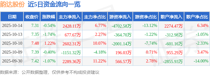 证券之星消息,截至2025年10月14日收盘,韵达股份(002120)报收于7.31元,下跌0.54%,换手率1.73%,成交量48.66万手,成交额3.58亿元。