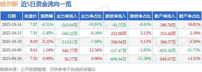 证券之星消息,截至2025年10月14日收盘,哈尔斯(002615)报收于7.87元,下跌0.51%,换手率2.24%,成交量6.85万手,成交额5427.29万元。