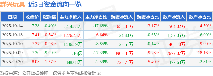 证券之星消息,截至2025年10月14日收盘,群兴玩具(002575)报收于7.38元,下跌0.4%,换手率2.86%,成交量16.91万手,成交额1.25亿元。