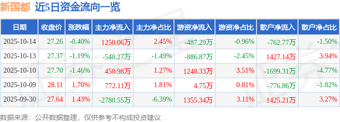 证券之星消息,截至2025年10月14日收盘,新国都(300130)报收于27.26元,下跌0.4%,换手率4.23%,成交量18.38万手,成交额5.1亿元。