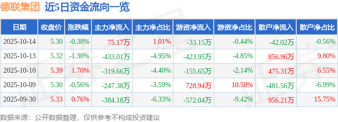 证券之星消息,截至2025年10月14日收盘,德联集团(002666)报收于5.3元,下跌0.38%,换手率2.78%,成交量13.94万手,成交额7459.2万元。