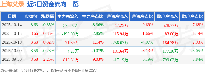 证券之星消息,截至2025年10月14日收盘,上海艾录(301062)报收于8.63元,下跌0.35%,换手率2.55%,成交量7.95万手,成交额6887.81万元。