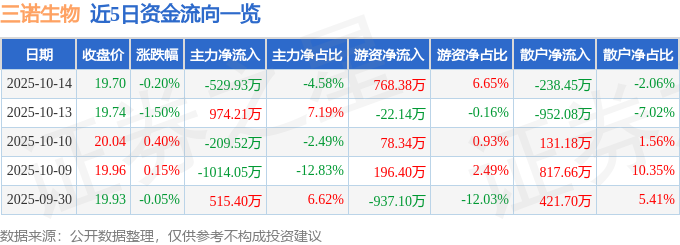 证券之星消息,截至2025年10月14日收盘,三诺生物(300298)报收于19.7元,下跌0.2%,换手率1.3%,成交量5.85万手,成交额1.16亿元。