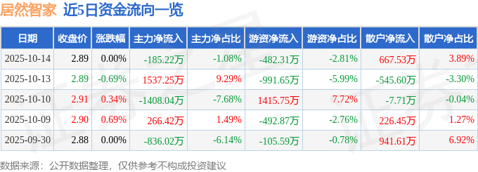 证券之星消息,截至2025年10月14日收盘,居然智家(000785)报收于2.89元,上涨0.0%,换手率1.0%,成交量59.17万手,成交额1.71亿元。