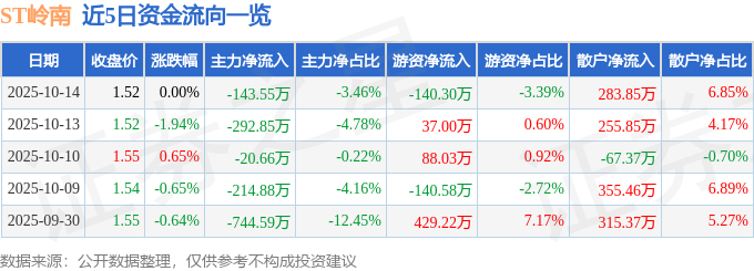 证券之星消息,截至2025年10月14日收盘,ST岭南(002717)报收于1.52元,上涨0.0%,换手率1.68%,成交量27.21万手,成交额4144.68万元。