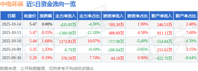 证券之星消息,截至2025年10月14日收盘,中电环保(300172)报收于5.47元,上涨0.0%,换手率3.47%,成交量18.17万手,成交额9952.17万元。