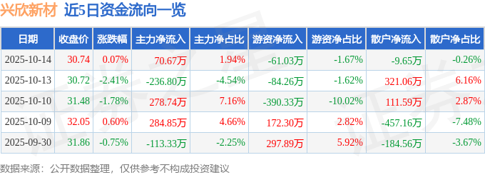 证券之星消息,截至2025年10月14日收盘,兴欣新材(001358)报收于30.74元,上涨0.07%,换手率2.32%,成交量1.18万手,成交额3649.96万元。