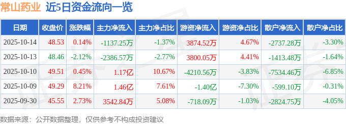 证券之星消息,截至2025年10月14日收盘,常山药业(300255)报收于48.53元,上涨0.14%,换手率1.84%,成交量16.93万手,成交额8.3亿元。