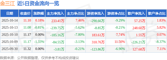 10月14日的资金流向数据方面,主力资金净流入233.41万元,占总成交额7.46%,游资资金净流出290.66万元,占总成交额9.29%,散户资金净流入57.25万元,占总成交额1.83%。