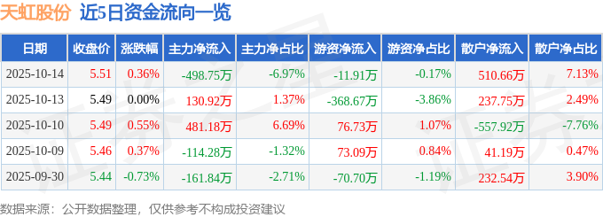 证券之星消息,截至2025年10月14日收盘,天虹股份(002419)报收于5.51元,上涨0.36%,换手率1.11%,成交量12.98万手,成交额7157.54万元。