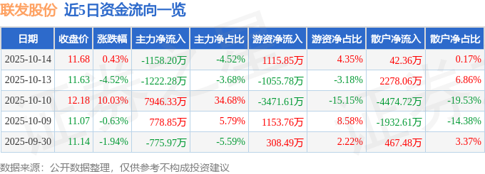 10月14日的资金流向数据方面,主力资金净流出1158.2万元,占总成交额4.52%,游资资金净流入1115.85万元,占总成交额4.35%,散户资金净流入42.36万元,占总成交额0.17%。