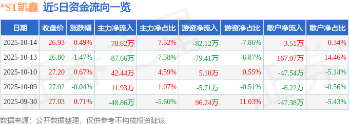 证券之星消息,截至2025年10月14日收盘,*ST凯鑫(300899)报收于26.93元,上涨0.49%,换手率0.95%,成交量3894.0手,成交额1045.18万元。