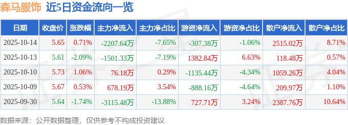 证券之星消息,截至2025年10月14日收盘,森马服饰(002563)报收于5.65元,上涨0.71%,换手率2.3%,成交量50.83万手,成交额2.89亿元。