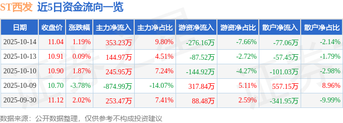 证券之星消息,截至2025年10月14日收盘,ST西发(000752)报收于11.04元,上涨1.19%,换手率1.23%,成交量3.26万手,成交额3604.91万元。