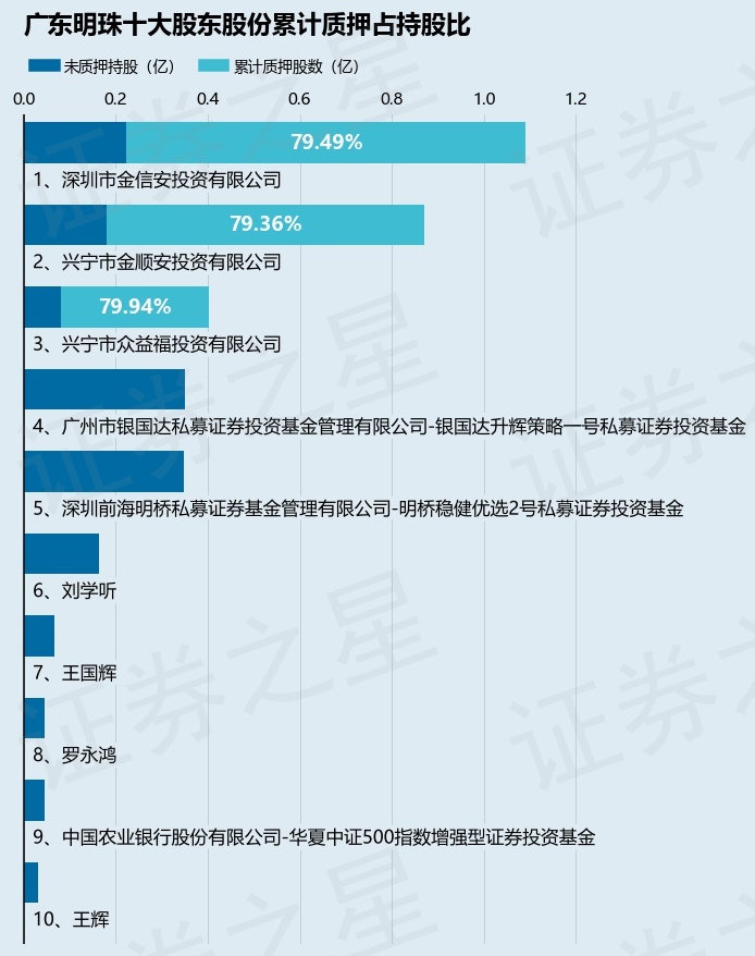 截止本公告日,股东深圳市金信安投资有限公司已累计质押股份8675.0万股,占其持股总数的79.49%,股东兴宁市金顺安投资有限公司已累计质押股份6902.0万股,占其持股总数的79.36%,股东兴宁市众益福投资有限公司已累计质押股份3215.2万股,占其持股总数的79.94%。本次质押后广东明珠十大股东的累计质押股份占持股比例(占持股比例的计算以公司最新一期财务报表公布的十大股东的持股总数为基准)见下图: