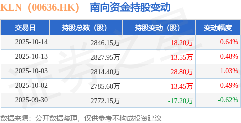 证券之星消息,10月14日南向资金增持18.2万股KLN(00636.HK)。近5个交易日中,获南向资金增持的有4天,累计净增持56.8万股。近20个交易日中,获南向资金增持的有15天,累计净增持262.28万股。截至目前,南向资金持有KLN(00636.HK)2846.15万股,占公司已发行普通股的1.57%。