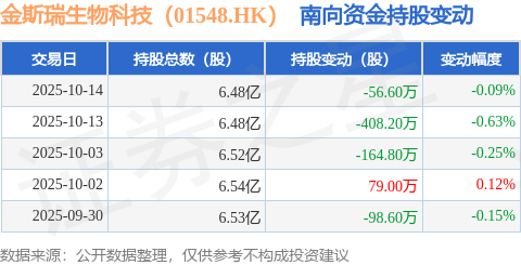 证券之星消息,10月14日南向资金减持56.6万股金斯瑞生物科技(01548.HK)。近5个交易日中,获南向资金减持的有4天,累计净减持649.2万股。近20个交易日中,获南向资金减持的有15天,累计净减持3193.56万股。截至目前,南向资金持有金斯瑞生物科技(01548.HK)6.48亿股,占公司已发行普通股的29.64%。