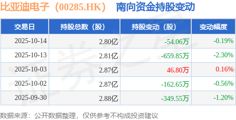 证券之星消息,10月14日南向资金减持54.06万股比亚迪电子(00285.HK)。近5个交易日中,获南向资金减持的有4天,累计净减持1179.31万股。近20个交易日中,获南向资金减持的有14天,累计净减持1603.61万股。截至目前,南向资金持有比亚迪电子(00285.HK)2.8亿股,占公司已发行普通股的12.43%。