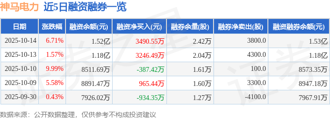 神马电力融资融券信息显示,融资方面,当日融资买入1.06亿元,融资偿还7137.52万元,融资净买入3490.55万元。融券方面,融券卖出4800.0股,融券偿还1000.0股,融券余量2.42万股,融券余额100.45万元。融资融券余额1.53亿元。