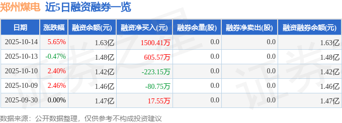 郑州煤电融资融券信息显示,融资方面,当日融资买入5606.12万元,融资偿还4105.71万元,融资净买入1500.41万元。融券方面,融券卖出0.0股,融券偿还0.0股,融券余量0.0股,融券余额0.0万元。融资融券余额1.63亿元。