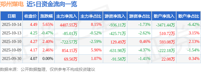 证券之星消息,截至2025年10月14日收盘,郑州煤电(600121)报收于4.49元,上涨5.65%,换手率9.97%,成交量121.44万手,成交额5.4亿元。