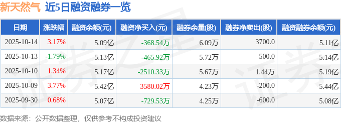 新天然气融资融券信息显示,融资方面,当日融资买入4571.46万元,融资偿还4940.0万元,融资净偿还368.54万元。融券方面,融券卖出3900.0股,融券偿还200.0股,融券余量6.09万股,融券余额182.21万元。融资融券余额5.11亿元。