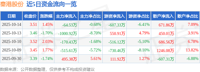 证券之星消息,截至2025年10月14日收盘,秦港股份(601326)报收于3.51元,上涨1.45%,换手率0.57%,成交量27.13万手,成交额9476.5万元。