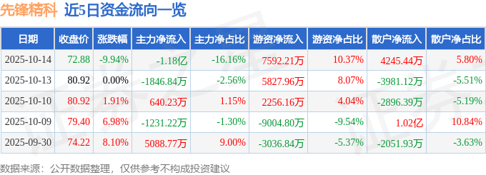 证券之星消息,截至2025年10月14日收盘,先锋精科(688605)报收于72.88元,下跌9.94%,换手率23.55%,成交量9.53万手,成交额7.32亿元。