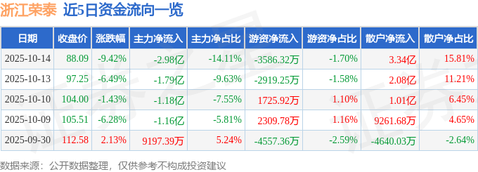 证券之星消息,截至2025年10月14日收盘,浙江荣泰(603119)报收于88.09元,下跌9.42%,换手率11.21%,成交量22.86万手,成交额21.1亿元。