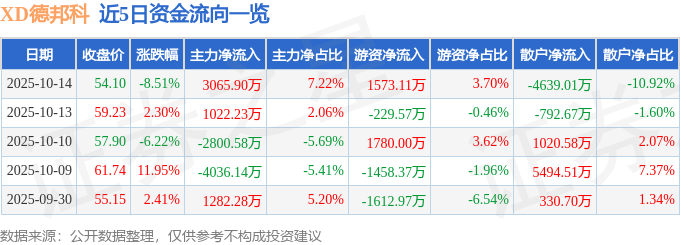 证券之星消息,截至2025年10月14日收盘,XD德邦科(688035)报收于54.1元,下跌8.51%,换手率5.36%,成交量7.62万手,成交额4.25亿元。