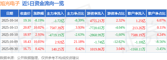 证券之星消息,截至2025年10月14日收盘,旭光电子(600353)报收于19.16元,下跌8.19%,换手率12.31%,成交量102.01万手,成交额20.51亿元。