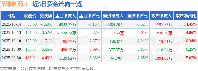 证券之星消息,截至2025年10月14日收盘,泽璟制药(688266)报收于93.6元,下跌7.6%,换手率2.12%,成交量5.61万手,成交额5.4亿元。