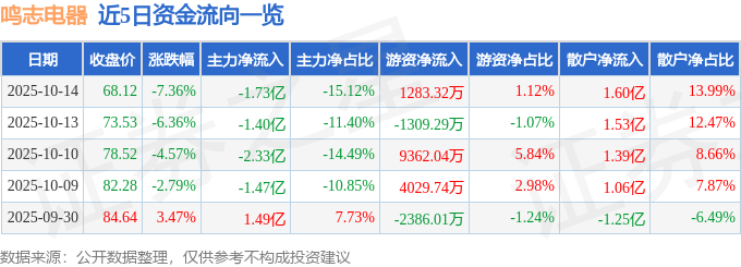证券之星消息,截至2025年10月14日收盘,鸣志电器(603728)报收于68.12元,下跌7.36%,换手率3.85%,成交量16.14万手,成交额11.42亿元。
