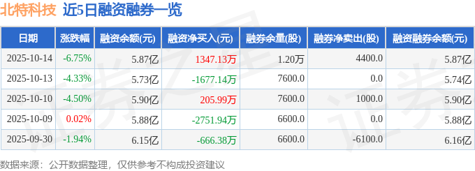 证券之星消息,截至2025年10月14日收盘,北特科技(603009)报收于46.98元,下跌6.75%,换手率3.32%,成交量11.23万手,成交额5.46亿元。