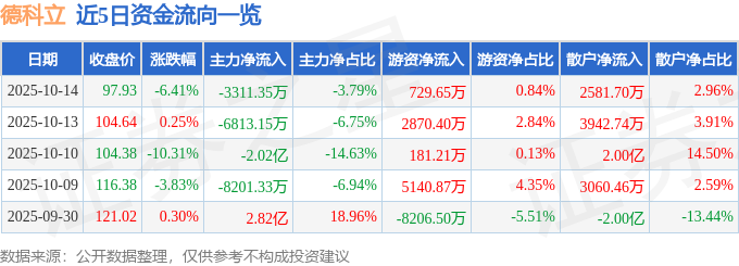 证券之星消息,截至2025年10月14日收盘,德科立(688205)报收于97.93元,下跌6.41%,换手率5.47%,成交量8.66万手,成交额8.73亿元。