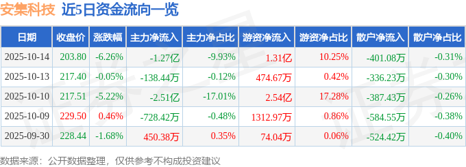 证券之星消息,截至2025年10月14日收盘,安集科技(688019)报收于203.8元,下跌6.26%,换手率3.6%,成交量6.07万手,成交额12.8亿元。