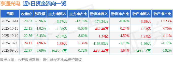 10月14日的资金流向数据方面,主力资金净流出3.27亿元,占总成交额13.16%,游资资金净流出174.34万元,占总成交额0.07%,散户资金净流入3.29亿元,占总成交额13.23%。