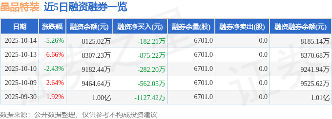 证券之星消息,截至2025年10月14日收盘,晶品特装(688084)报收于89.72元,下跌5.26%,换手率5.01%,成交量1.77万手,成交额1.6亿元。