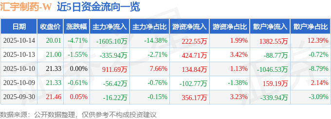 证券之星消息,截至2025年10月14日收盘,汇宇制药(688553)报收于20.01元,下跌4.71%,换手率1.57%,成交量5.4万手,成交额1.12亿元。