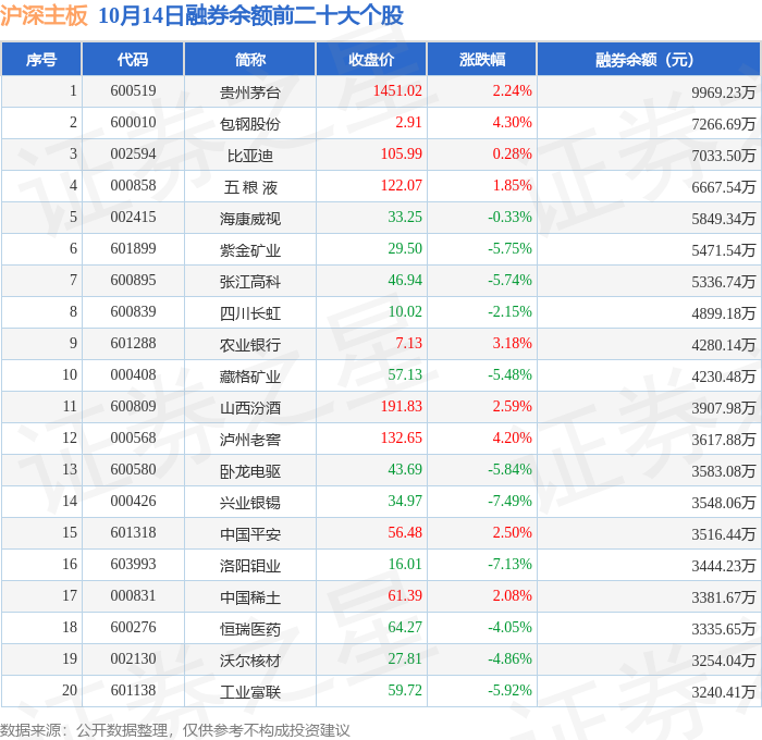 沪深主板融券余额前三分别为:贵州茅台(600519)融券余额9969.23万元、包钢股份(600010)融券余额7266.69万元、比亚迪(002594)融券余额7033.5万元,前20具体见下表: