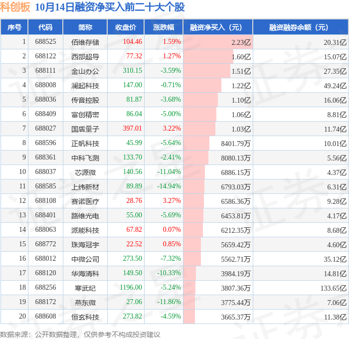 科创板融资净买入前三分别为:佰维存储(688525)融资净买入2.23亿元、西部超导(688122)融资净买入1.6亿元、金山办公(688111)融资净买入1.51亿元,前20具体见下表: