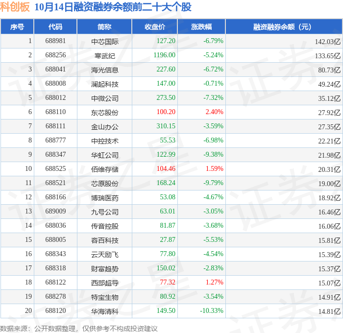 科创板融资融券余额前三分别为:中芯国际(688981)融资融券余额142.03亿元、寒武纪(688256)融资融券余额133.65亿元、海光信息(688041)融资融券余额80.73亿元,前20具体见下表: