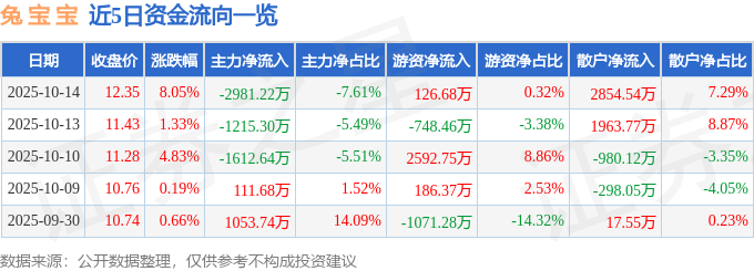 证券之星消息,截至2025年10月14日收盘,兔 宝 宝(002043)报收于12.35元,上涨8.05%,换手率4.47%,成交量32.89万手,成交额3.92亿元。