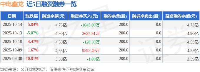 中电鑫龙融资融券信息显示,融资方面,当日融资买入2.55亿元,融资偿还2.71亿元,融资净偿还1645.0万元。融券方面,融券卖出0.0股,融券偿还0.0股,融券余量200.0股,融券余额0.28万元。融资融券余额4.73亿元。