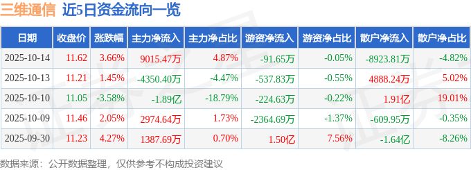 证券之星消息,截至2025年10月14日收盘,三维通信(002115)报收于11.62元,上涨3.66%,换手率21.37%,成交量160.73万手,成交额18.52亿元。