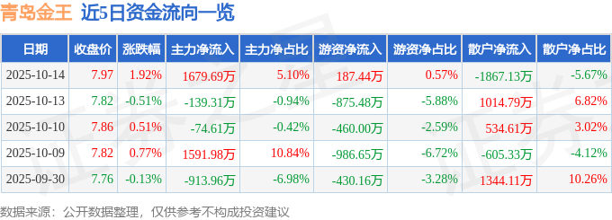 证券之星消息,截至2025年10月14日收盘,青岛金王(002094)报收于7.97元,上涨1.92%,换手率5.99%,成交量41.34万手,成交额3.29亿元。