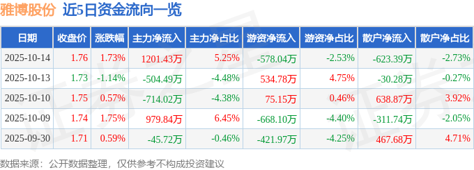 证券之星消息,截至2025年10月14日收盘,雅博股份(002323)报收于1.76元,上涨1.73%,换手率6.06%,成交量128.44万手,成交额2.29亿元。